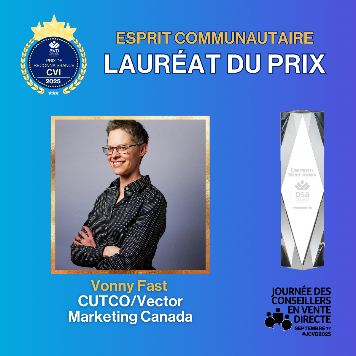 La pierre angulaire du « Project Impack » réside dans ses journées « Actes de gentillesse aléatoires », qui créent un effet boule de neige en surprenant et en émerveillant les communautés grâce à des gestes significatifs. Des événements ont déjà eu lieu à Toronto, London et Calgary, permettant ainsi de recueillir 40 000 $ en 2024 et d’aider à nourrir plus de 200 familles. Vonny travaille chez Vector / Cutco depuis plus de 30 ans. Elle a dépassé les 10 millions $ de ventes personnelles tout en restant profondément ancrée dans le service communautaire. Elle ne cesse de mobiliser les entreprises locales, les bénévoles et les clients pour répandre la gentillesse. Visionnez son histoire.