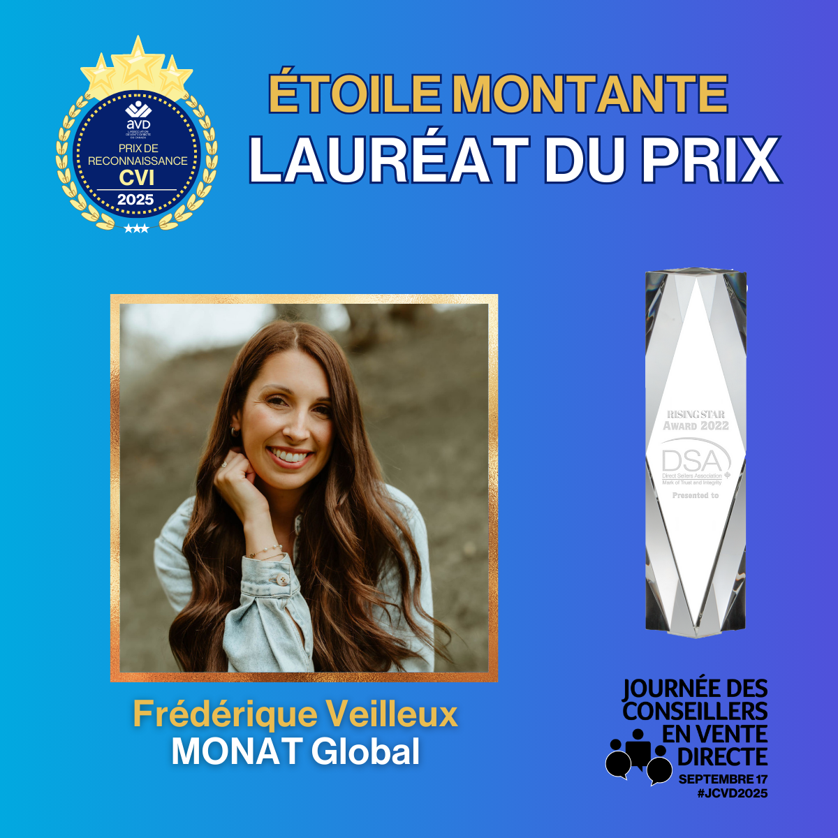 Le prix « Étoile montante » récompense un consultant en vente indépendant (CVI) émergent qui, au cours de ses cinq premières années d'implication, présente un potentiel énorme. Ils ont enregistré une croissance démontrable dans l'industrie de la vente directe et ont eu un impact positif sur leur équipe et leur entreprise.